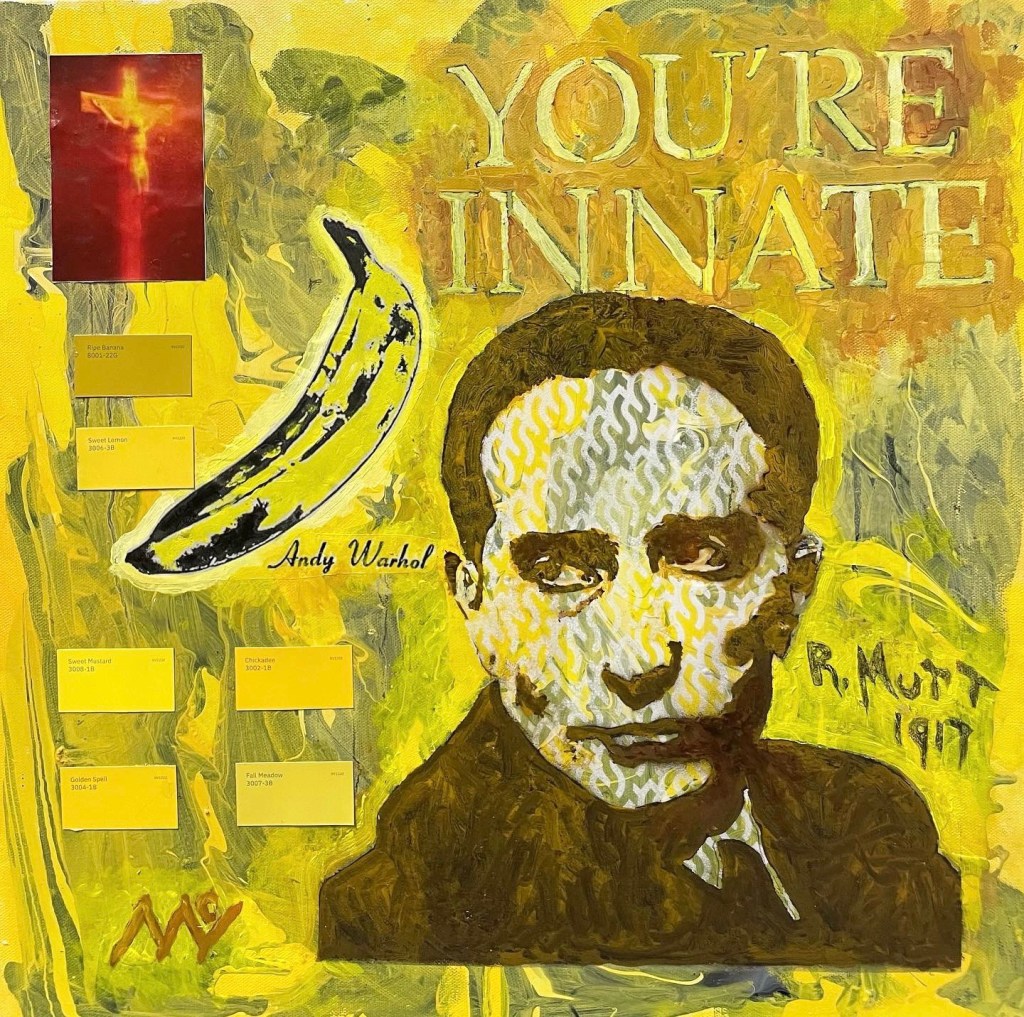 “The Absurdity of Color” explores the associative or symbolic nature of color and how it contributes to our interpretation of meaning and individual truth, as well as how we sometimes are quick to draw conclusions when reality is far more complex. The painting is a collection of 9 similarly composed canvases. Much of the imagery, similar to how we consume information, is drawn from and is easily accessible on the internet. Each canvas, representing a single color, addresses specific themes (history, art history, music, race, environment, gender identity, etc.). However, there is no “single source of truth” within a single color; no “black and white” answers. Rather, the combination of canvases is intended to lead the viewer to make continuous connections across the full spectrum of colors to formulate deeper meanings and personal interpretations of my intent as the artist as well as reflect on their own personal beliefs.