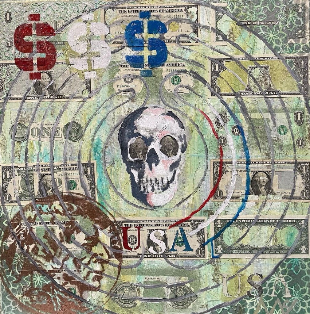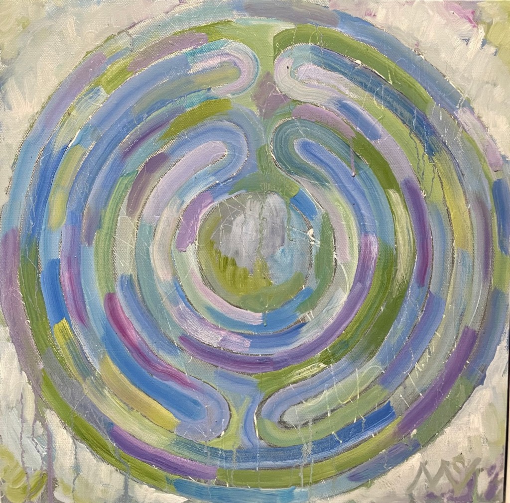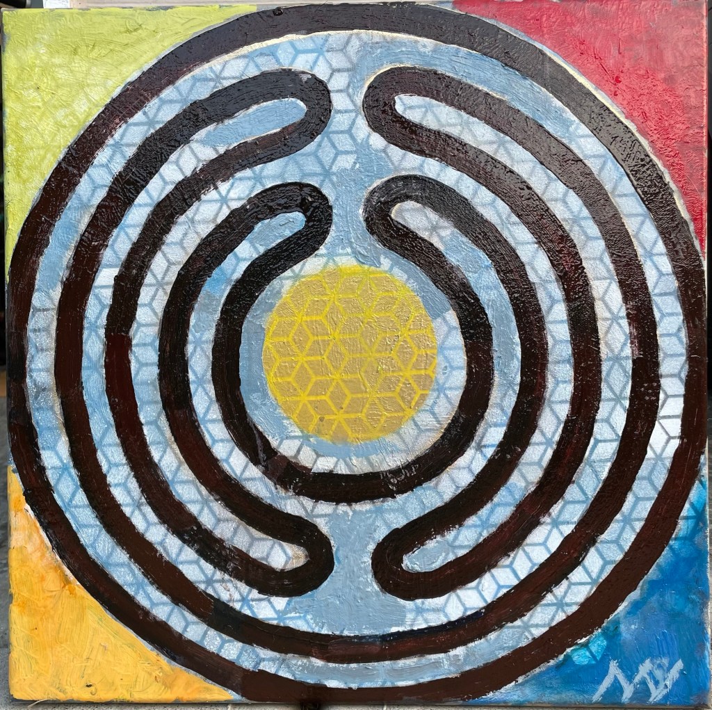 The “Symbol Series” broadly examines the innate desire to associate meaning through the use of symbols, and how suggestion and our personal experiences guide our interpretation of the world around us. A single symbol, a labyrinth of concentric interlocking rings, is centrally incorporated and is repeated as the core compositional element in all the paintings. Certain paintings in the series exclusively evaluate the symbol itself in formal explorations, making the interpretation of the symbols more ambiguous. The grouping of memento mori paintings, however, employ the symbol along with floral images/patterns and a human skull as a reflection on life’s journey and the recognition of mortality. These paintings embrace the emotive quality of symbols and their ability to lead us to conclusions around intent and meaning as well as analogous contemplation of our own lives.